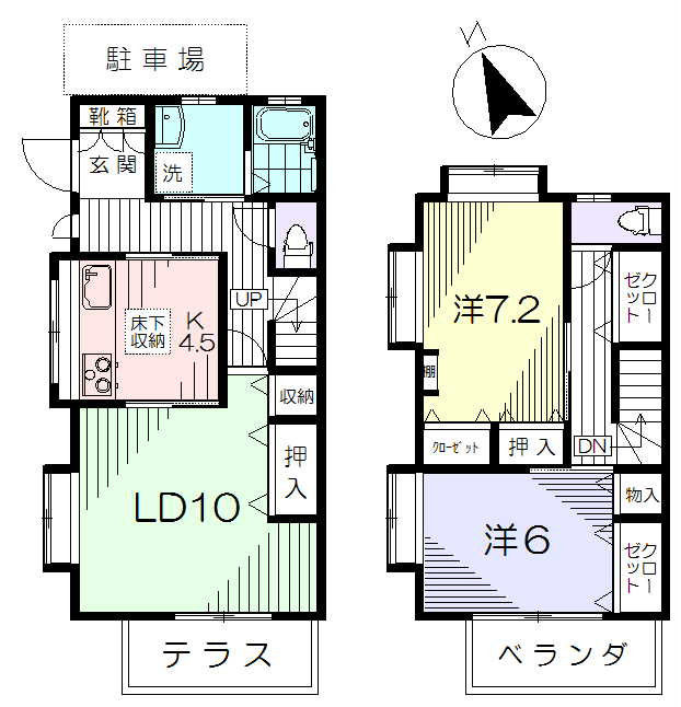 バストイレ別、エアコン、ガスキッチン、システムキッチン、室内洗濯機置場、追焚バス、洗面所独立、独立洗面台、浴室乾燥機、温水洗浄便座、TVモニター付きインターホン、フローリング、バルコニー、収納、クローゼット、床下収納、階段下収納、靴箱、メゾネット、食洗器あり(残置物扱い)、敷地内駐車場付き(小型車限定)
